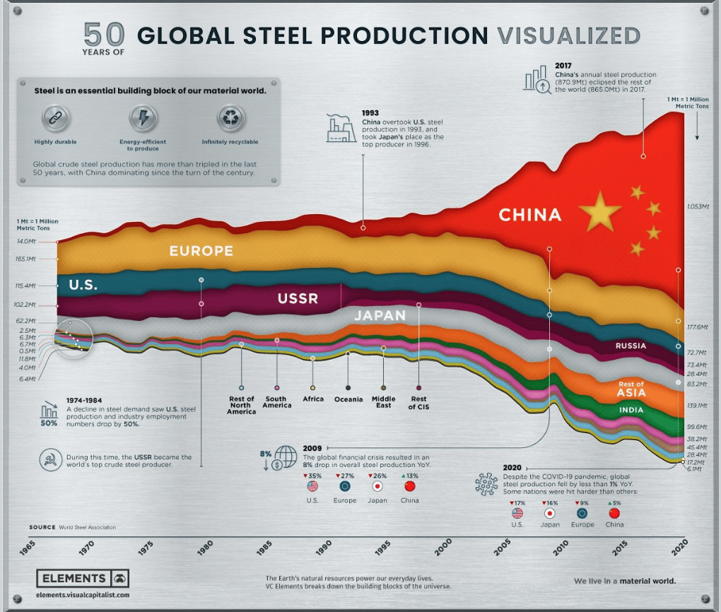 La producci贸n de acero a nivel global se duplic贸 en los 煤ltimos 25 a帽os gracias a China